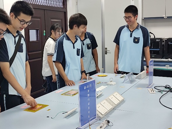 7月11日那坡中学的初中生们前来研学,在物理学院九楼的天象厅外,陈列着许多由物理学院师生参与研发的作品,志愿者向同学们详细介绍了学院参与的中国空间站上探测器项目,365英国主导研制的X射线偏振探测器(CXPD立方星)以及蓝色能源实验室研发的摩擦发电机。同学们近距离感受到了科技之美,埋下“科研的种子”。