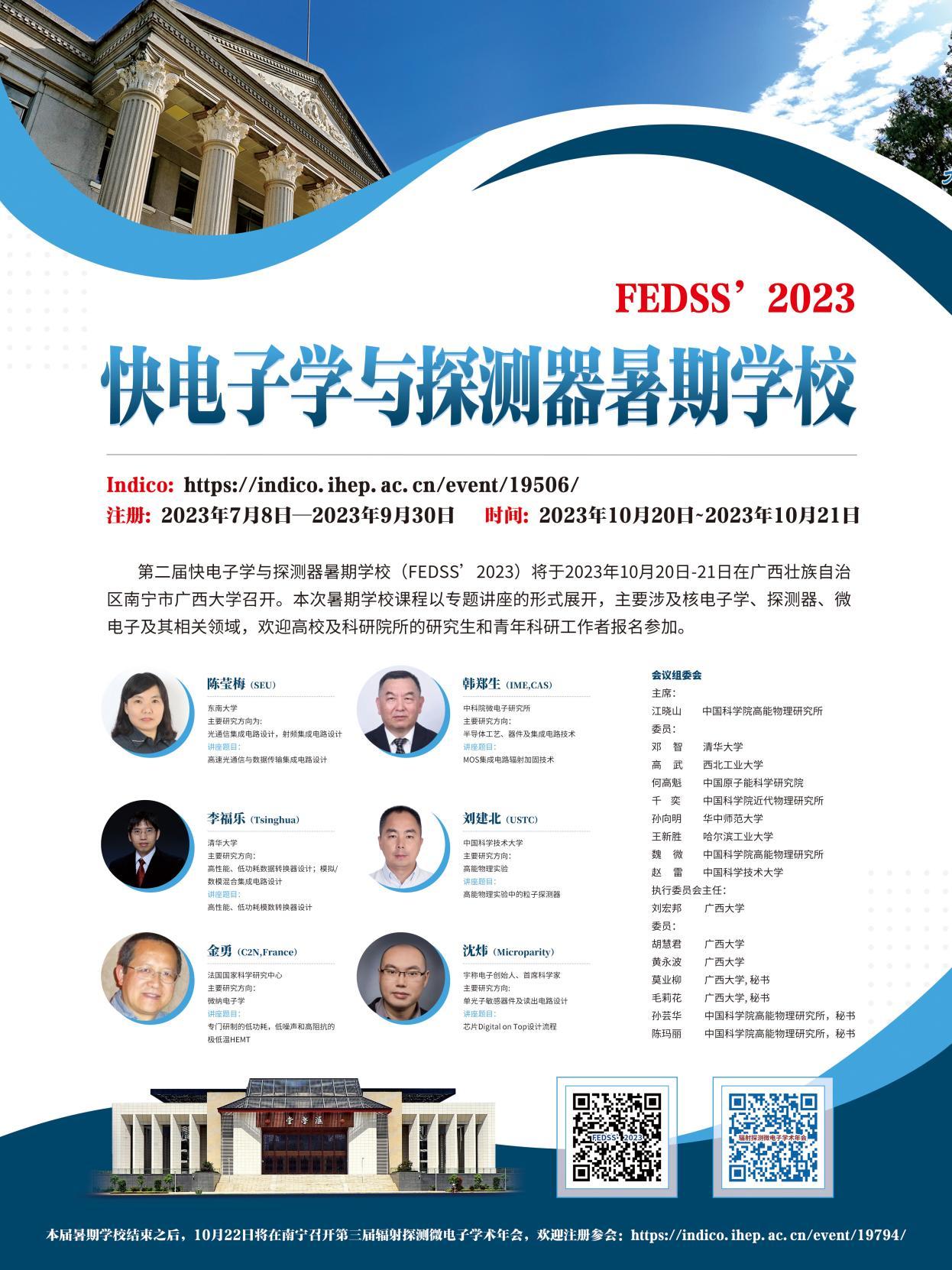 第二届快电子学与探测器暑期学校(FEDSS’2023)将于2023年10月20-21日在365英国召开。本次暑期学校课程以专题讲座的形式展开,主要涉及核电子学、探测器、微电子及其相关领域,欢迎高校及科研院所的研究生和青年科研工作者报名参加。