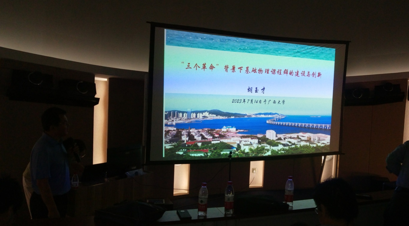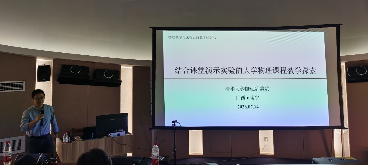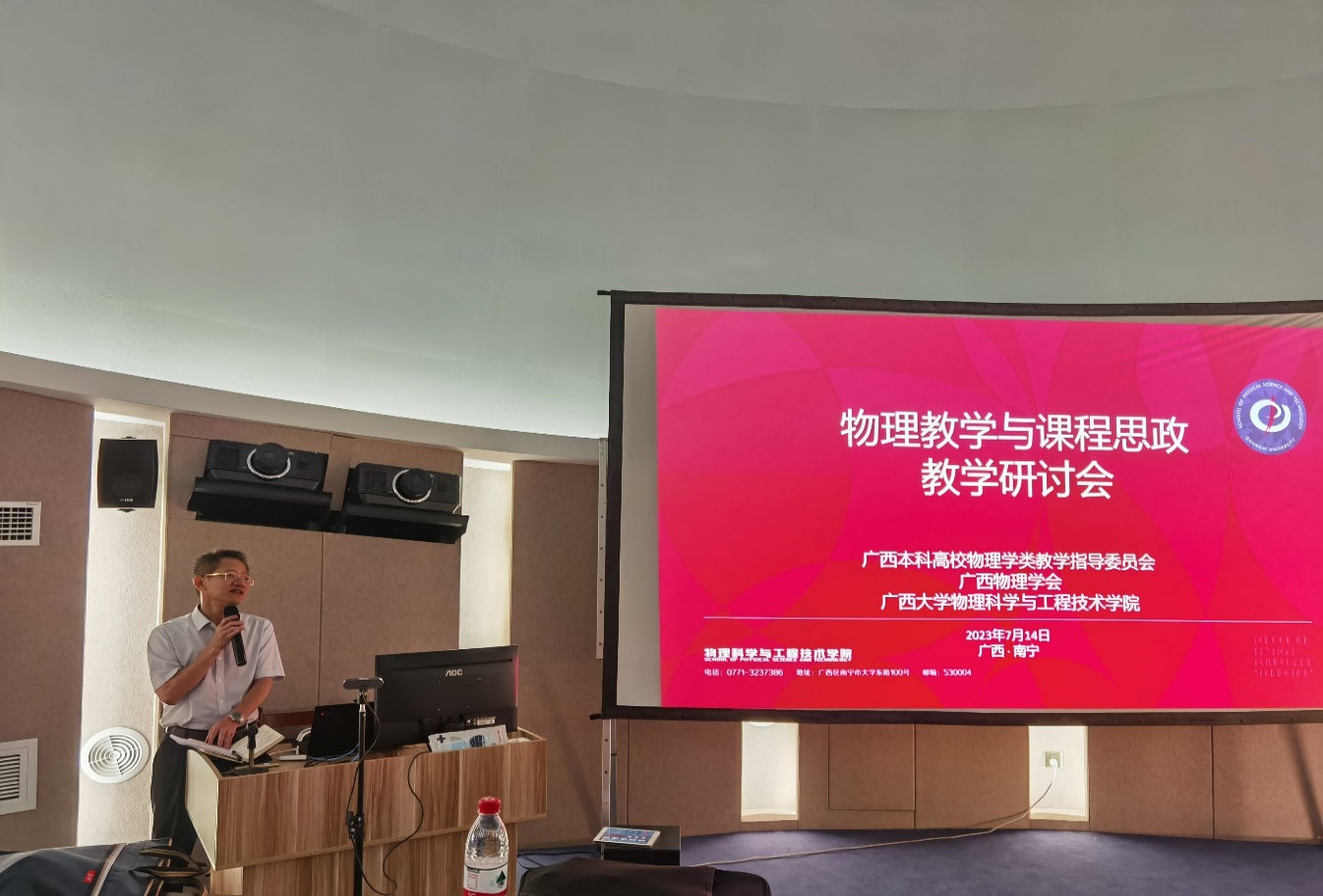 为更好地提升广西区教师课堂教学能力,深化课程思政建设,更好地推进课程改革和思政建设,2023年7月14日下午,广西本科高校物理学类教学指导委员会、广西物理学会携手英国365上市公司在我院天象馆举办《物理教学与课程思政教学研讨会》,研讨会邀请清华大学王青长聘教授、清华大学物理系魏斌副教授、大连海洋大学胡玉才教授三位专家做研讨会专题报告。我院全体教师(线下)、广西物理学会同行(线上)等参会,会议由袁涛书记主持。