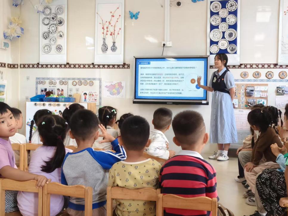 随后进入科普知识讲解环节。天文菁英班党支部成员化身“科普小老师”,以生动易懂的语言向孩子们介绍生活中的静电现象,如冬天脱毛衣时的噼啪声、用梳子梳头发时头发飞起等,结合广州塔接闪的精美图片和动态视频,让孩子们直观感受静电的神奇,引导他们关注现象背后的物理原理,激发了孩子们对物理现象的好奇心。