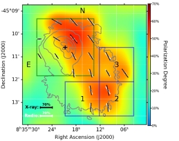 图一:左图显示Vela PWN 在 2-5 keV 能量范围内的偏振度(网格大小45角秒),叠加Chandra望远镜的轮廓。黑色(白色)线条的长度表示 X 射线(射电)的偏振度的测量值,方向表示磁场方向。右图显示左图的偏振矢量的偏振量角图其中半径和极角分别表示偏振度和磁场方向。