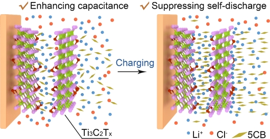 针对以上问题,我院新能源团队提出将向列相液晶分子4-n-戊基-4′-对氰基苯(5CB)引入Ti3C2Tx薄膜和LiCl电解质中。复合膜电极充满电后,插层于Ti3C2Tx纳米片之间和溶解于电解质中的5CB分子,由于电流变效应方向会发生改变而垂直于纳米片,形成一个阻挡层,从而增加电解质的粘度,并抑制离子的交叉扩散/重分布和寄生法拉第反应。结果表明,所提出的方案可以有效抑制MXenes基超级电容器(SCs)的自放电,促进了MXenes基超级电容器在能量存储设备和集成电子器件中的应用。