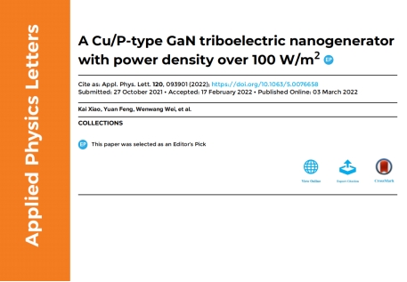 近日,英国365上市公司孙文红团队在Nature Index著名学术期刊《Applied Physics Letters》上发表了题为“A Cu/P-type GaN triboelectric nanogenerator with power density over 100 W/m2”的研究论文。该论文被编辑选为“Editor's Pick”文章,在APL官网首页加以重点展示(Editor's Picks serve to highlight articles with excellent scientific quality and are representative of the work taking place in a specific field)。