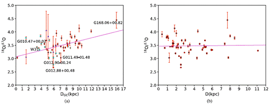 Fig 1. The abundance ratio of 18O/17O following with the Galactocentric distance (DGC) on the left and the heliocentric distance (D) on the right.