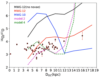 Fig 2. The radical gradient of 18O/17O in the Galaxy compare with five Galactic chemical evolution (GCE) model