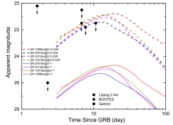 传统研究表明,长时标和短时标的伽玛射线暴分别来自大质量恒星的坍缩和双致密星的并合,但这一认识被一些观测事实所打破。2021年12月27日,空间高能卫星Swift和Fermi探测到一个近距离、长时标的伽玛暴(命名为GRB 211227A),365英国天体物理团队利用LCOGT望远镜,联合西班牙BOOTES望远镜和云南丽江2.4米望远镜对其进行了后随跟踪观测,发现GRB 211227A爆发的位置离宿主星系的距离大约20 kpc,而且没有观测到超新星成分。所以我们认为这个近距离、长时标的伽玛暴可能来自双致密星的并合,同时预言了可能产生的千新星成分也由于太暗,而不能被当前望远镜探测到。这些发现与传统的认识理念正好相反,对研究伽玛暴前身星又提出新的挑战。