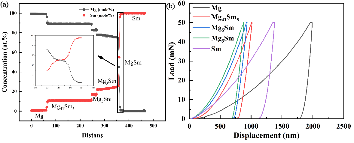 Mg-Sm system annealed at 798 K for 60 h: (a) Element distribution in diffusion region; (b) Displacement-load curve of related phase layer.