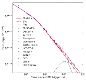 伽马暴与超新星之间的关系已经被确立二十几年了,但是伽马暴与超新星成协的物理性质依旧没有得到很好的研究。2022年10月9号13:16:59.000 UT,GBM触发伽马暴GRB 221009A。就流量而言,GRB 221009A是目前观测到的最亮的伽马暴,而且红移小 z =0.151。所以,对于伽马暴GRB 221009A是否与超新星SN 2022xiw成协也是被广泛讨论。LCOGT、GWAC-F60、KAIT和Nickel望远镜也对其进行后随观测,我们在R波段获得了良好的光变。我们发现在GRB 221009A被触发 ~ 11天后,其R波段光变显现出一个小鼓包,这可能是一个超新星鼓包。于是,我们用折断幂律函数和56Ni模型拟合R波段光变(见图1)。得到的最好拟合结果:超新星喷射物质量Mej = 3.70 M⊙ , 56Ni的质量MNi = 0.23 M⊙ (这里的M⊙ 是太阳质量), 动能ESN,K = 2.35×1052 erg。我们拿GRB 221009A和其他GRB-SN成协事件比较,在同样的距离下,我们发现在我们的样本中只有SN 2003lw和SN 2011kl可以在GRB 221009A的余辉下被明显观测到(见图2)。其中SN 2003lw的峰值出现得较晚,而SN 2011kl则被认为可能是超亮超新星。所以我们建议GRB 221009A与SN 2022xiw成协,只是SN 2022xiw的辐射很大程度被GRB 221009A的余辉掩盖了。虽然SN 2022xiw很亮,GRB 221009A的余辉相对更亮。