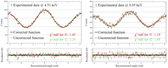 2 30°斜入射实验数据的拟合结果。左图:入射光子能量4.51 keV;右图:8.05 keV。入射光的偏振方向在入射平面内。