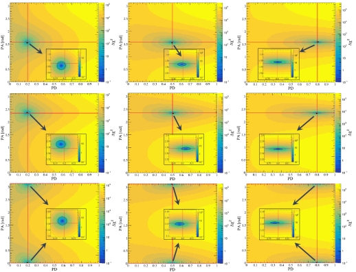3. 使用最小化卡方的方法对45°斜入射的模拟数据进行偏振重建的结果。图中包括了对不同偏振度和偏振角入射源进行偏振重建的结果,十字表示模拟器中偏振度和偏振角的输入值。子图中黑色、黄色和绿色环分别代表置信区间。