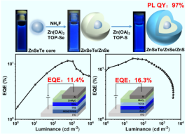 蓝光ZnSeTe量子点因其卓越的发光性能和环境友好特性,在推动高性能纯蓝色量子点发光二极管(QLED)用于高清显示器领域展现出广阔前景。然而,传统合成方法需要在高温条件下进行水基氢氟酸处理,这一复杂且危险的工艺制约了其应用推广。本工作开发出一种全新的环保合成策略,利用无机氟化物NH4F作为分子添加剂,成功简化了ZnSeTe/ZnSe/ZnS蓝光量子点的制备过程。新合成的量子点在纯蓝光区域展现出可调节的光致发光(PL)波长,并实现了接近单位的量子产率(QY)。研究发现,NH4F的引入有效钝化了ZnSeTe核,提升了量子点的稳定性,同时促进了后续高质量壳层的形成,显著降低了非辐射复合率,从而进一步提高了发光效率。为了验证这些量子点在实际应用中的性能,团队分别使用其作为发射层,构建了标准结构和倒置结构QLED器件。测试结果表明,标准QLED的外部量子效率(EQE)高达17.2%,倒置QLED则达到16.3%,性能表现与经典HF处理量子点制备的QLED相当,但避免了对环境和安全的威胁。这一环保合成方法为高效纯蓝量子点的制备提供了全新路径,同时为其他环保量子点材料的开发带来了新的启示,有望加速环保QLED技术的发展,助力绿色电子产业的升级与突破。